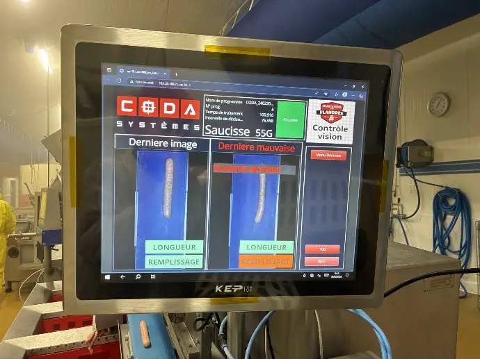 Notre client La charcuterie des Flandres souhaitait mettre en place un système de contrôle qualité automatisé afin de vérifier la conformité dimensionnelle des saucisses produites.